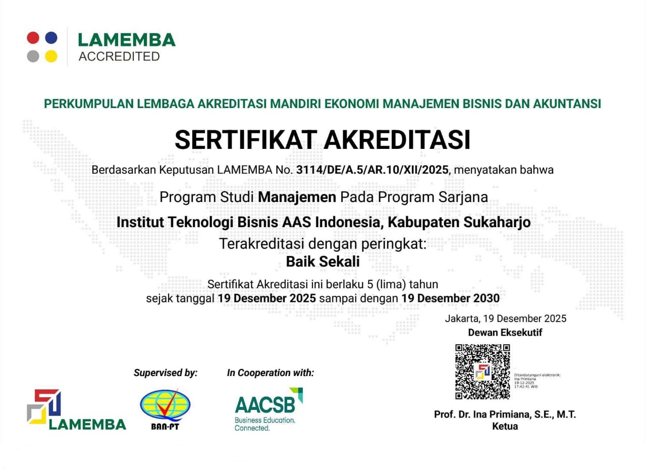 SUKOHARJO – Institut Teknologi Bisnis (ITB) AAS Indonesia kembali mengukuhkan posisinya sebagai institusi pendidikan bisnis terpercaya. Program Studi S1 Manajemen...